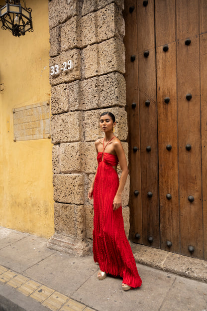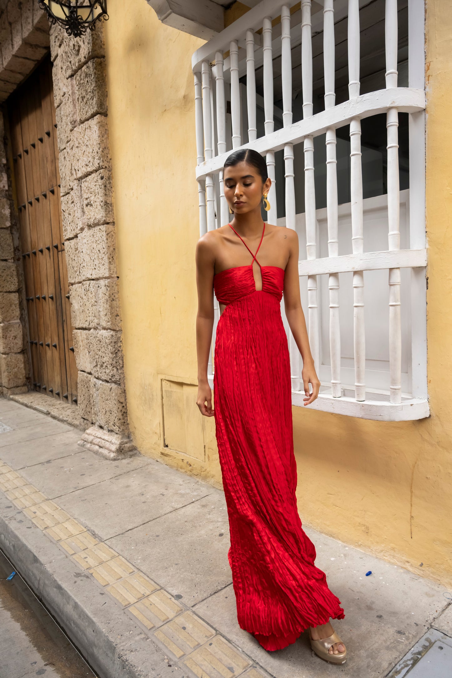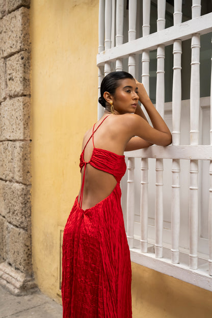 VESTIDO LARGO EN SATIN ROJO CON EFECTO ARRUGADO