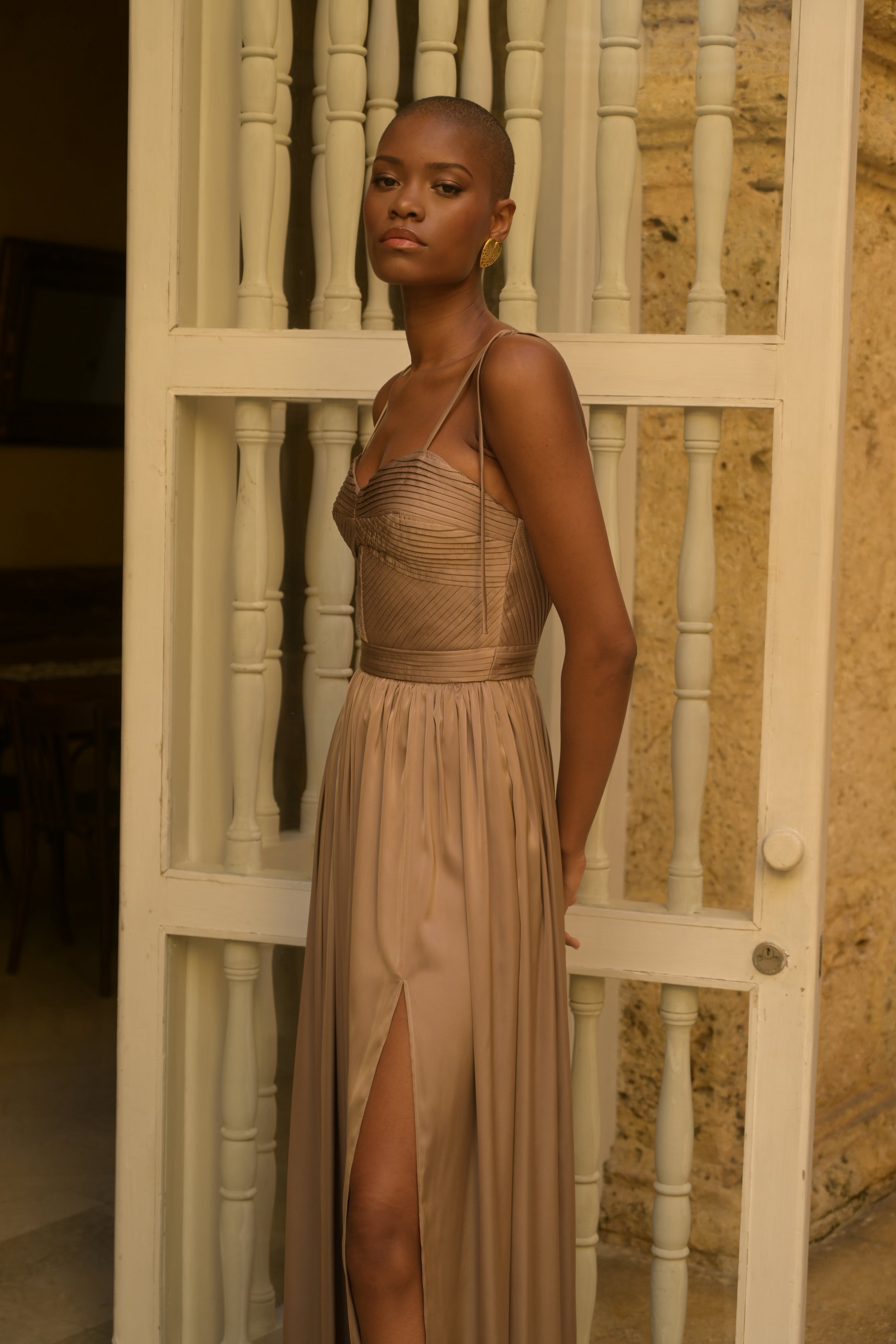 VESTIDO LARGO CON ALFORZAS EN EL TOP EN SATIN TAUPE