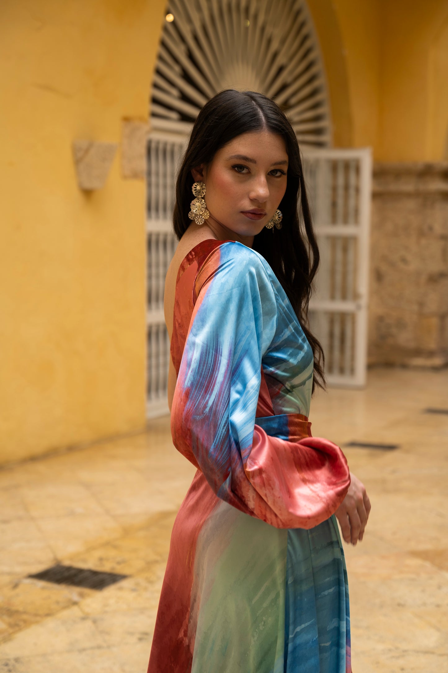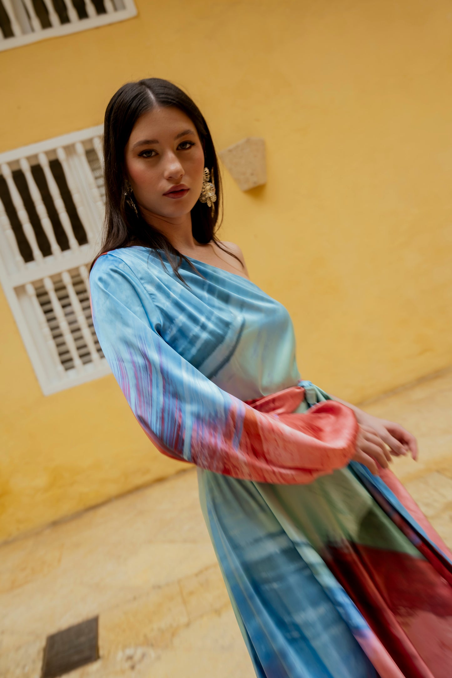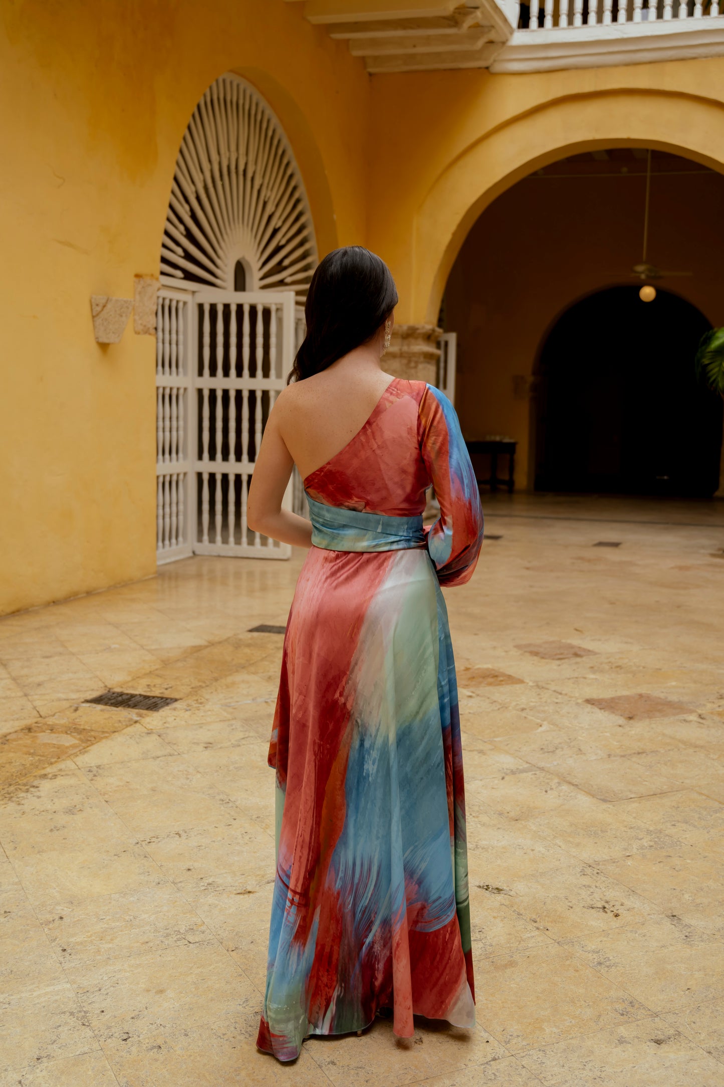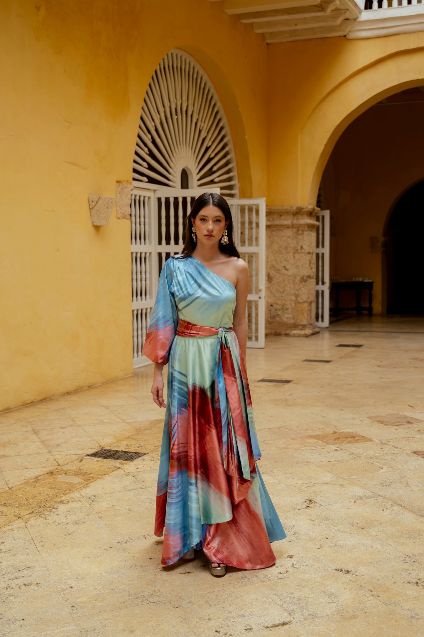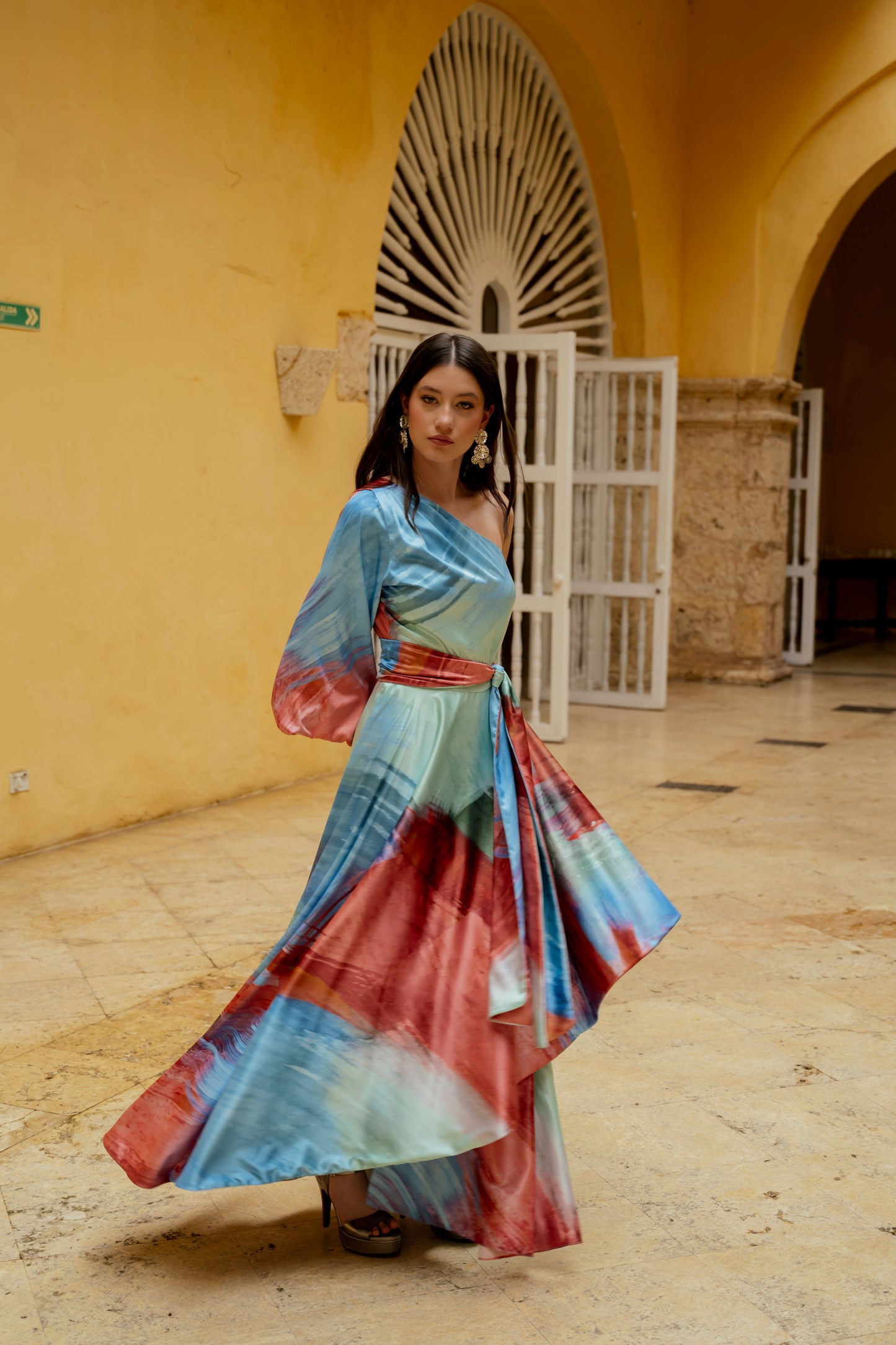 VESTIDO LARGO MEDIO HOMBRO EN ESTAMPADO ABSTRACTO AZUL VINO