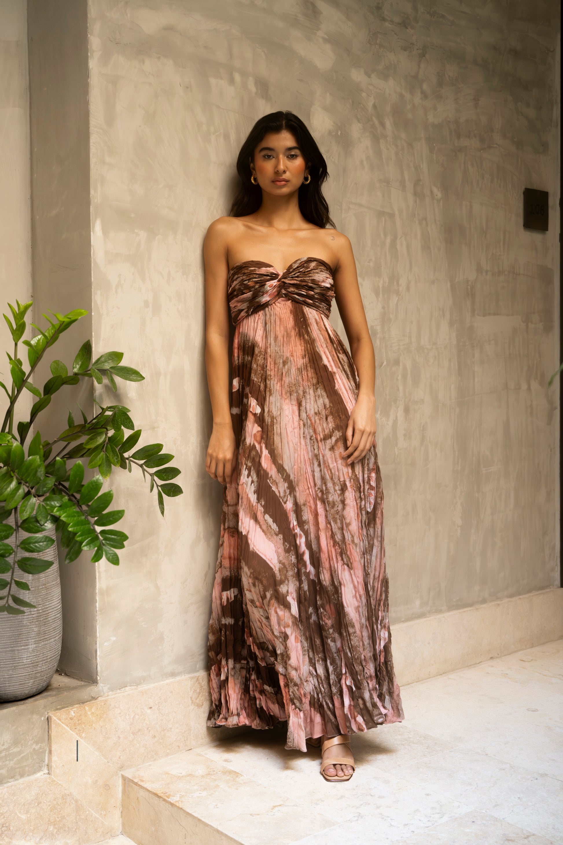 VESTIDO LARGO STRAPLESS EN ESTAMPADO ABSTRACTO ROSA CAFE